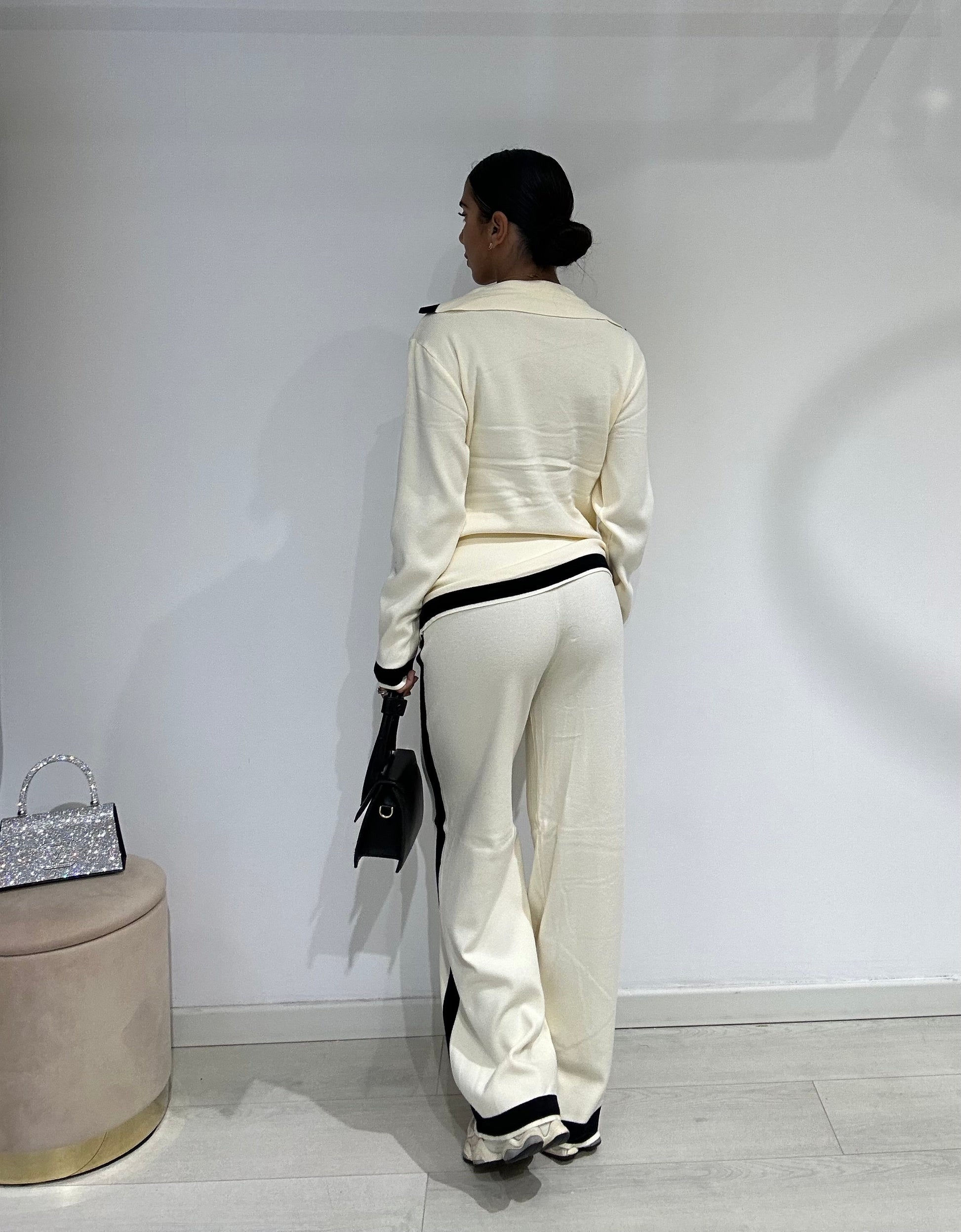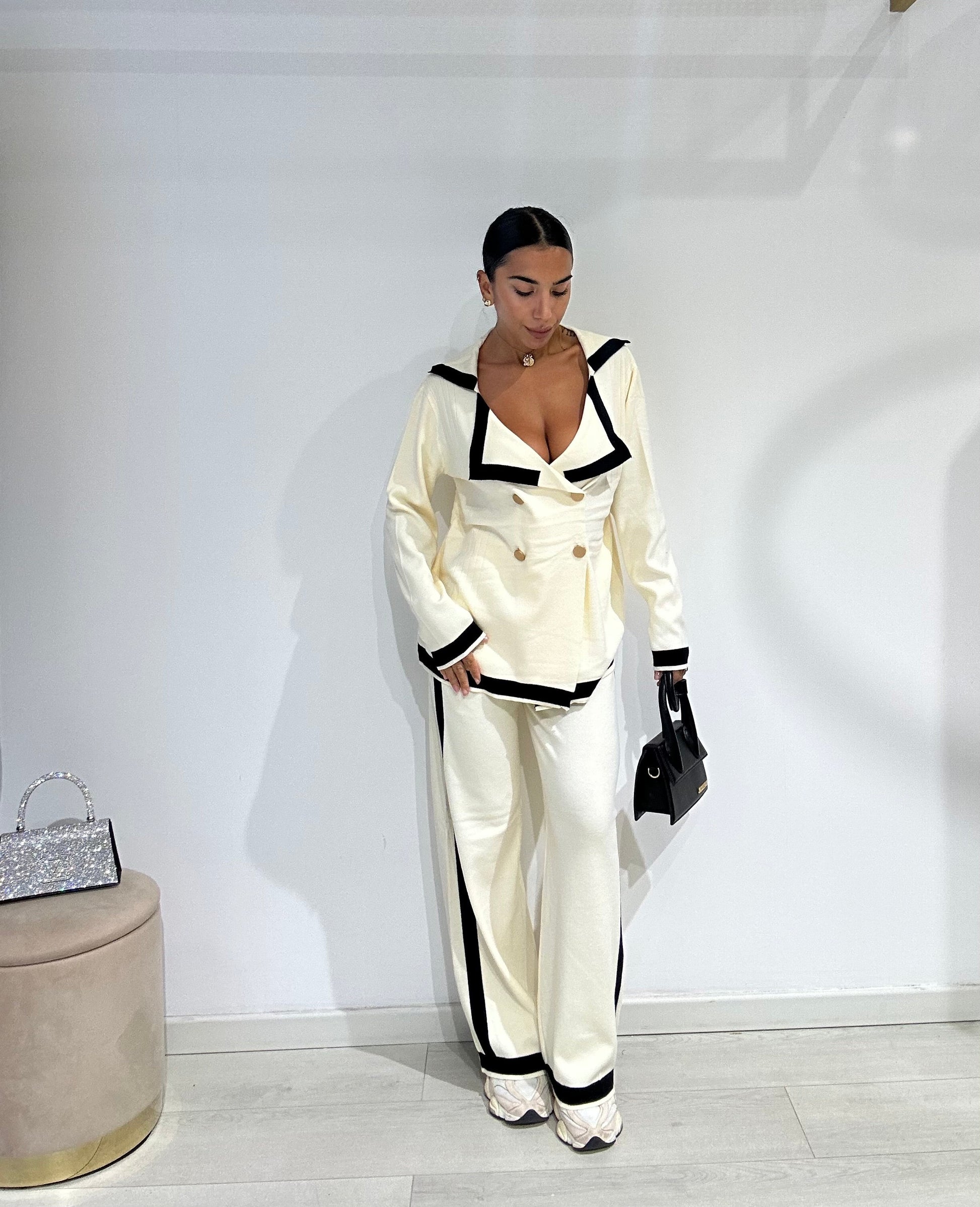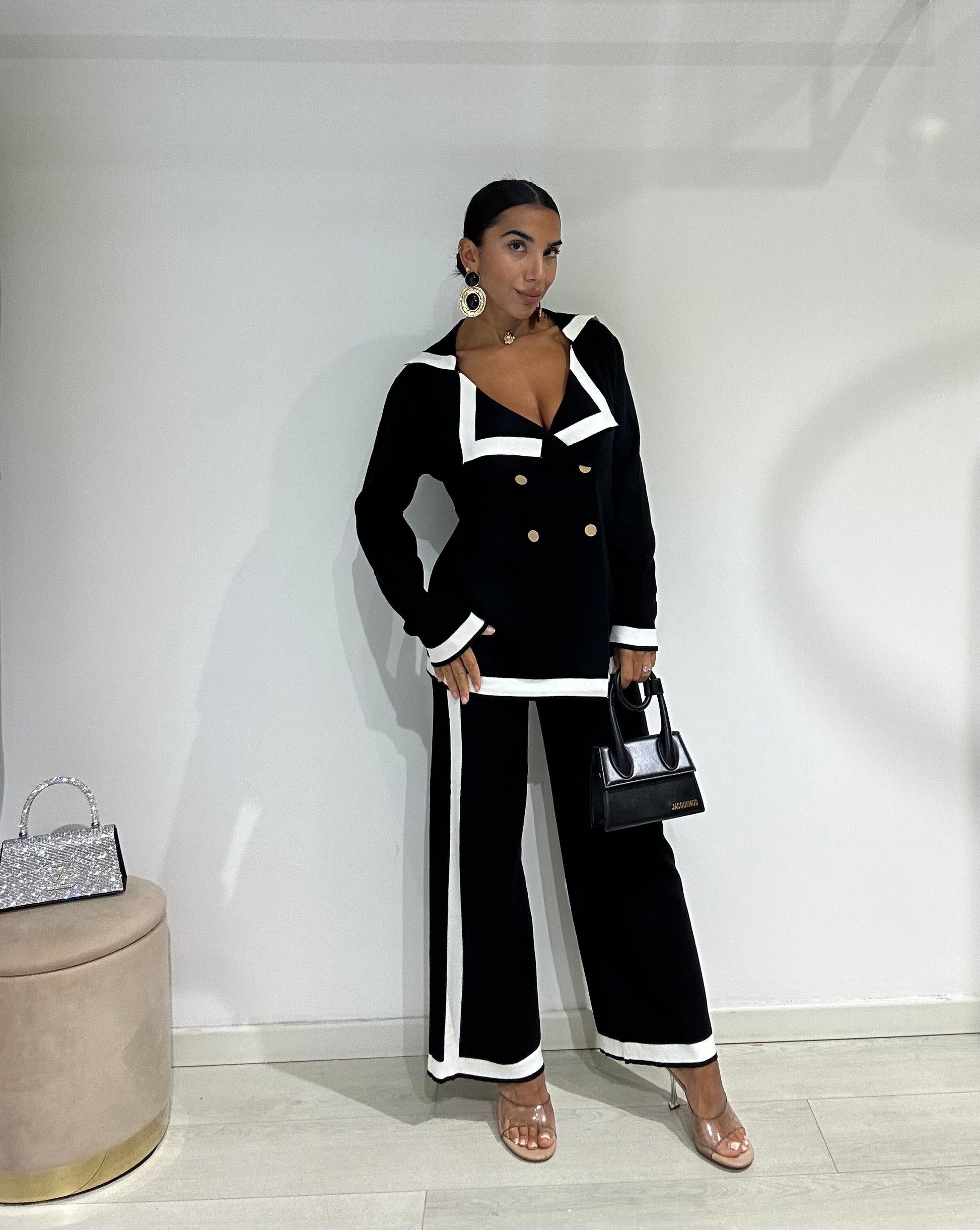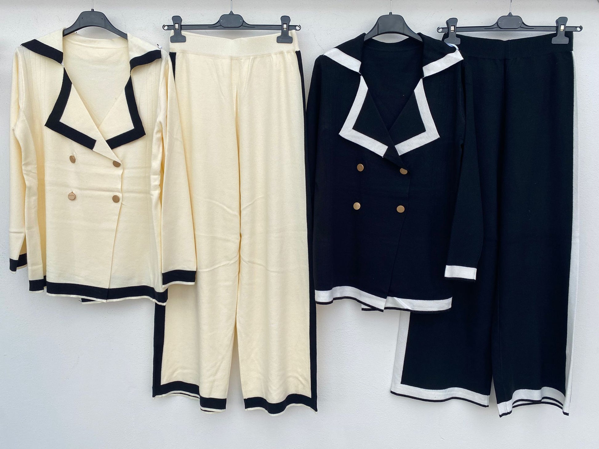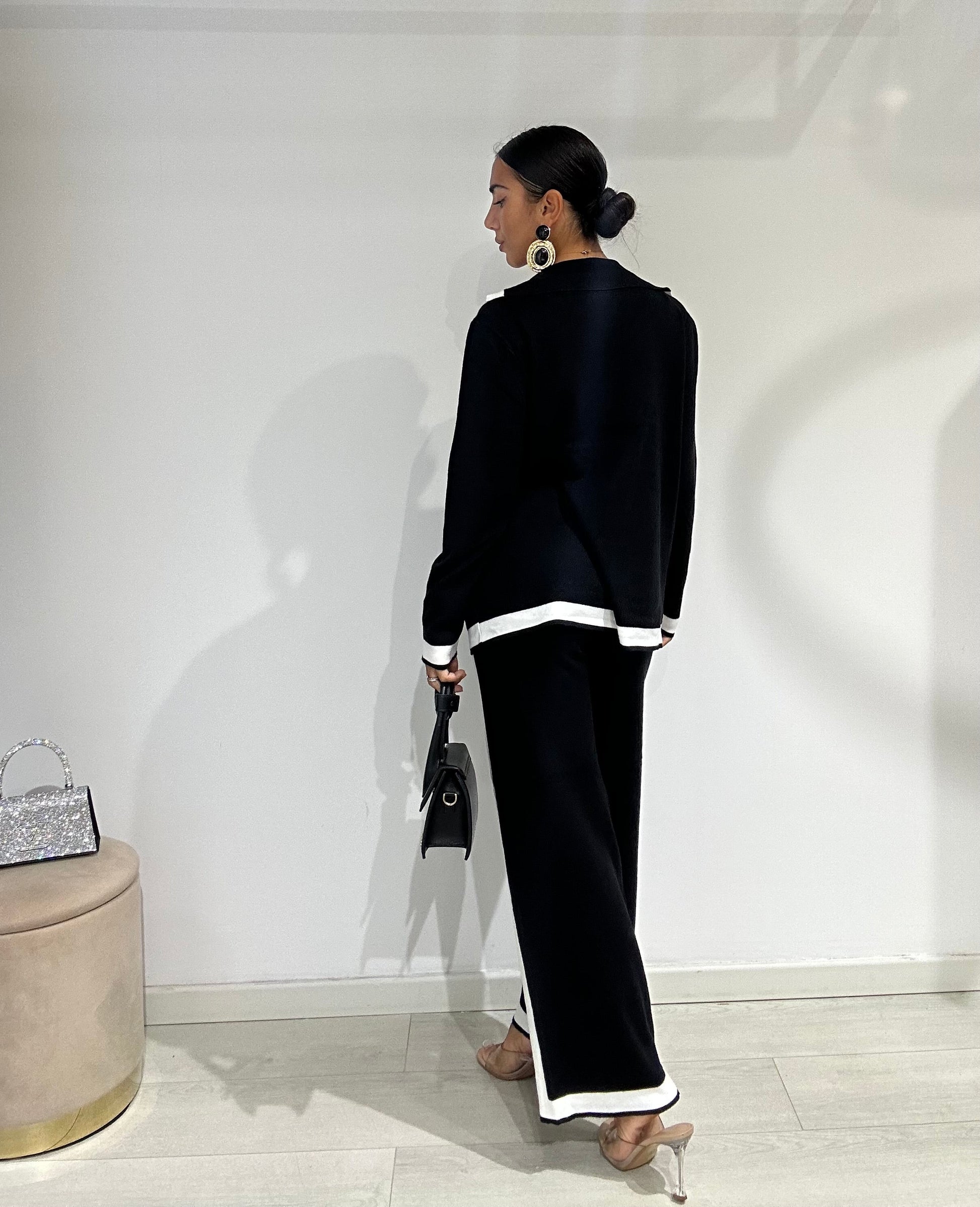 Smooth wool coordinated set consisting of palazzo trousers and a shawl-collar cardigan.