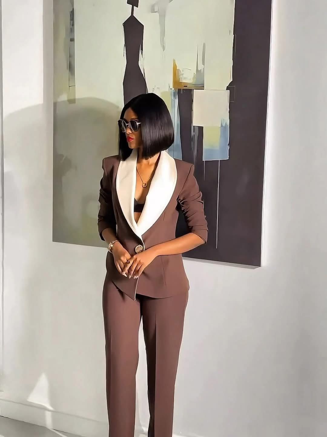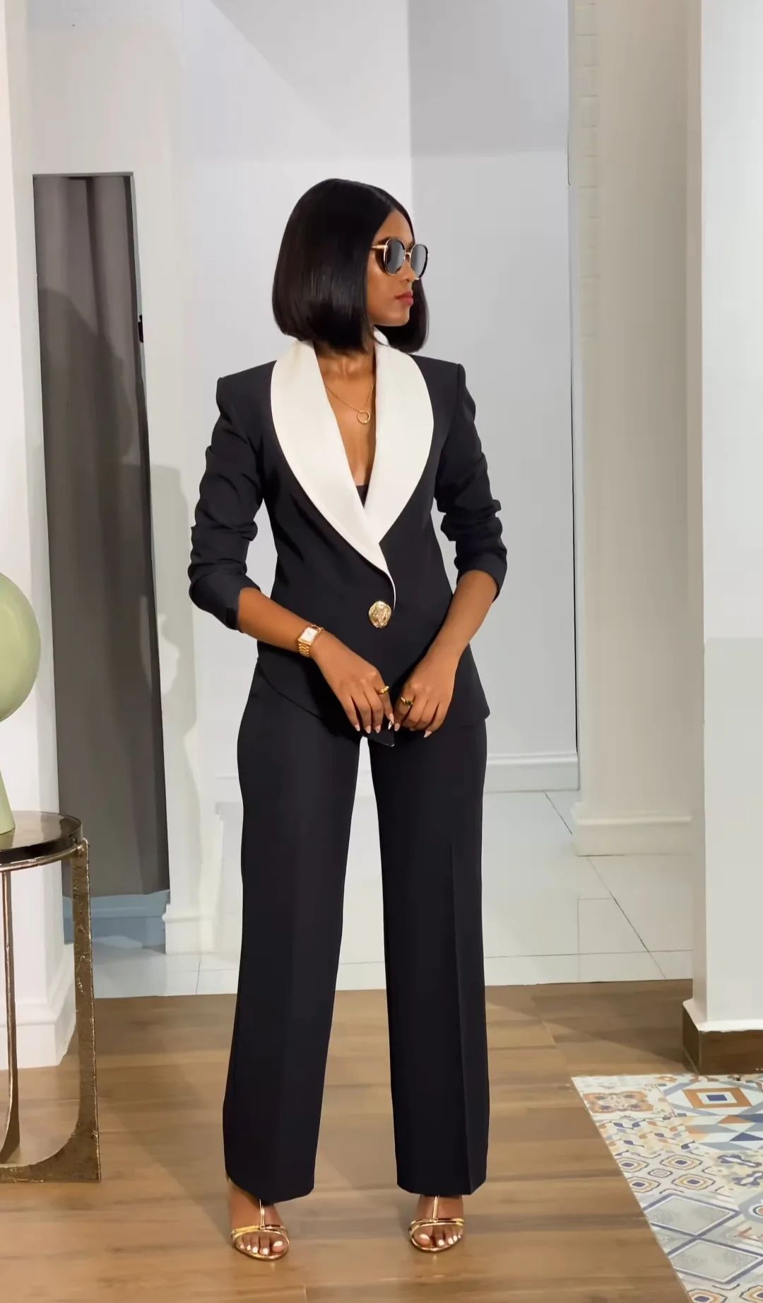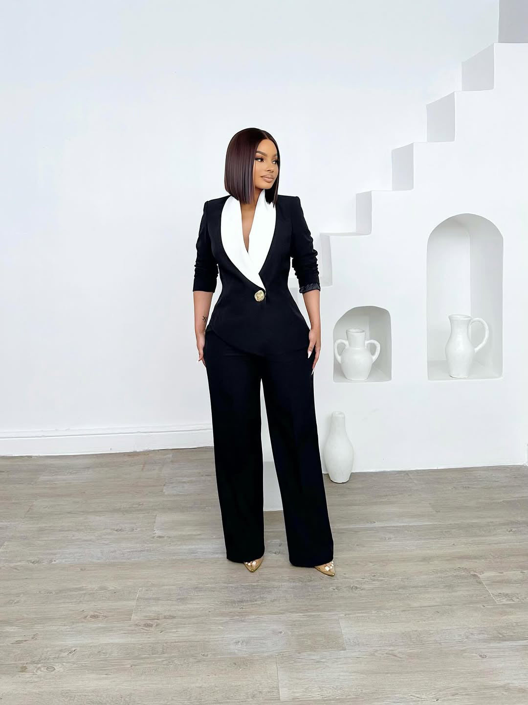 Elegant black jacket with contrasting white lapels and straight-cut trousers. A sophisticated set, ideal for events, business or refined appearances.