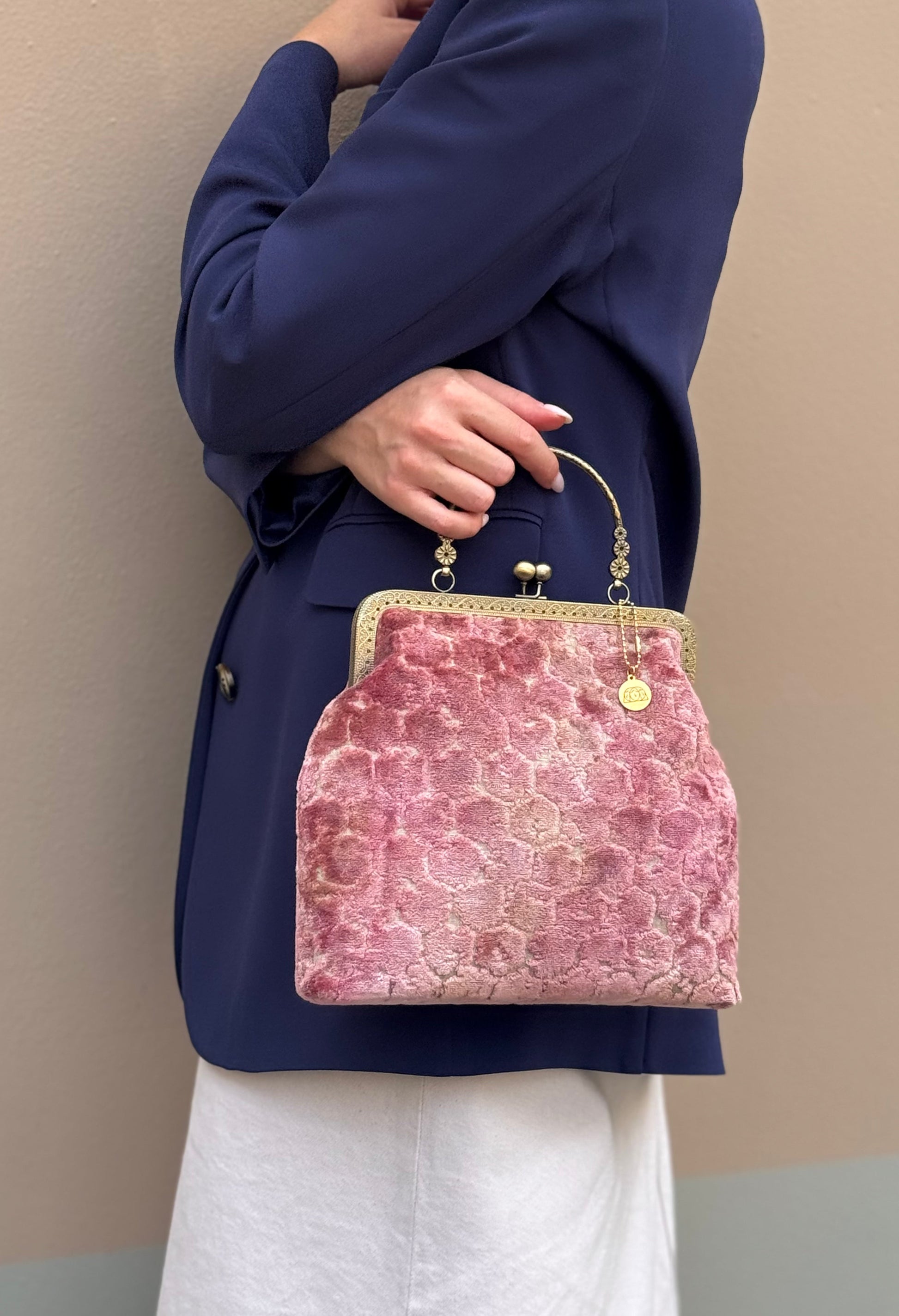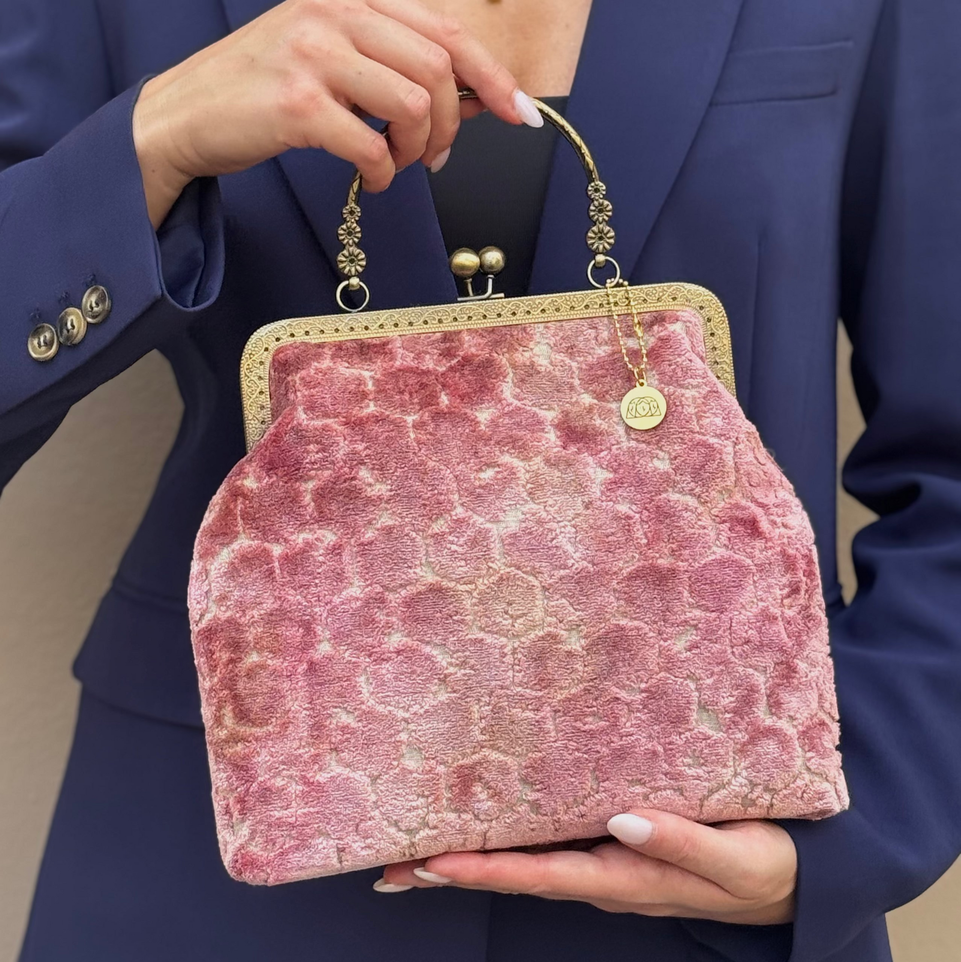 Our Margot Zucchero Filato is crafted from patterned velvet, featuring a 20 cm bronze-coloured clasp and a 60 cm detachable chain. The interior is lined with satin.